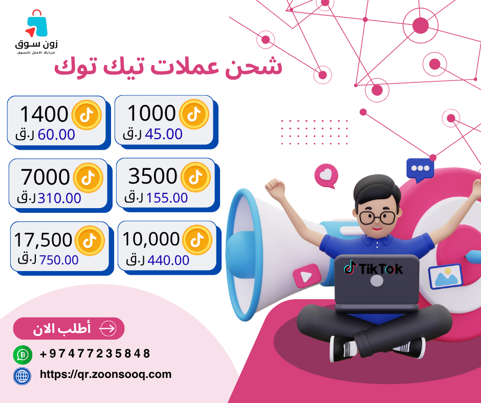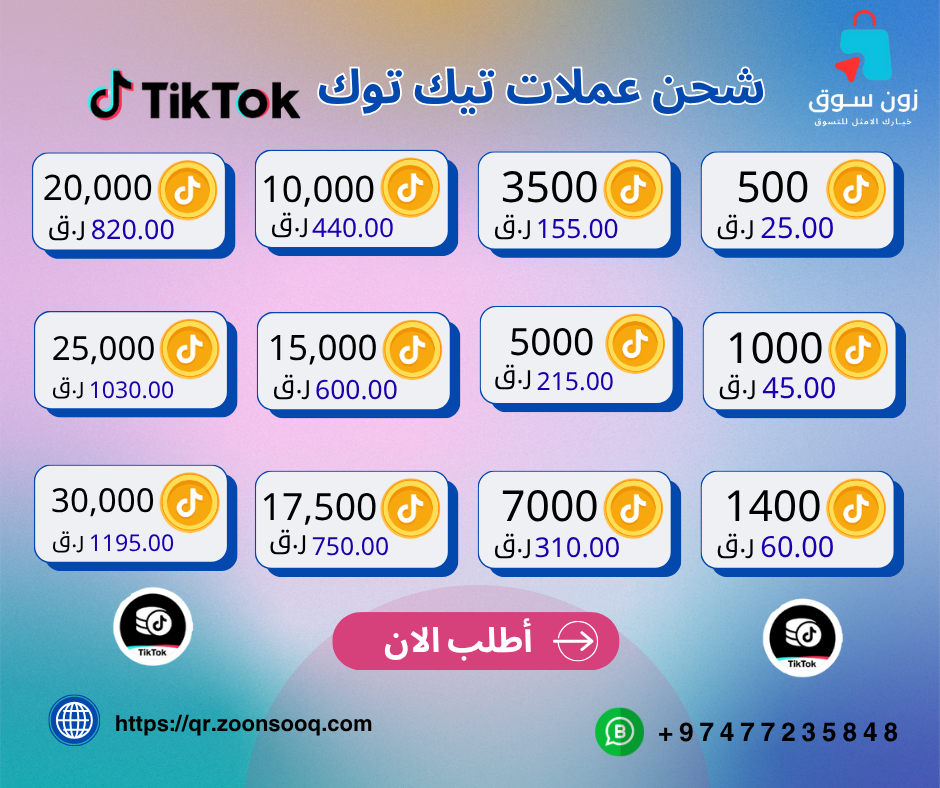بأسعار تنافسية للشحن أضغط علي اتمام الطلب وسيتم التواصل معك علي الواتس اب لاكمال عملية الشحن كيف يتم الشحن:- يتم ارسال رقم الهاتف المرتبط بالحساب ثم سنقوم بأرسال رقم علي الهاتف وانت تقوم بأرساله لنا . او الايميل والباسورد لصفحة التيك توك . الشحن يتم من 2 - 15 دقيقة .